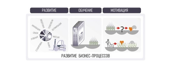 – мотивационной программой (когда сотрудники понимают, чем они занимаются, какова их роль в результате; их «видение» своей роли меняется в сторону увеличения продуктивности / эффективности; чувство сопричастности к миссии творит чудеса;