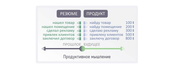 Модели интеллекта по мнению Дружинина В. Н. (1994) делятся на априорные (предвосхищающие, экстраполирующие) и апостериорные (анализирующие опыт). Замените прошлое на будущее, анализ на прогноз, опыт на продукт, чтобы выйти за рамки своей модели интеллекта. Разместите себя (свой продукт, услугу) в будущем. Измените РЕЗЮМИРУЮЩЕЕ (описательное) мышление на ПРОДУКТИВНОЕ (производящее) мышление.