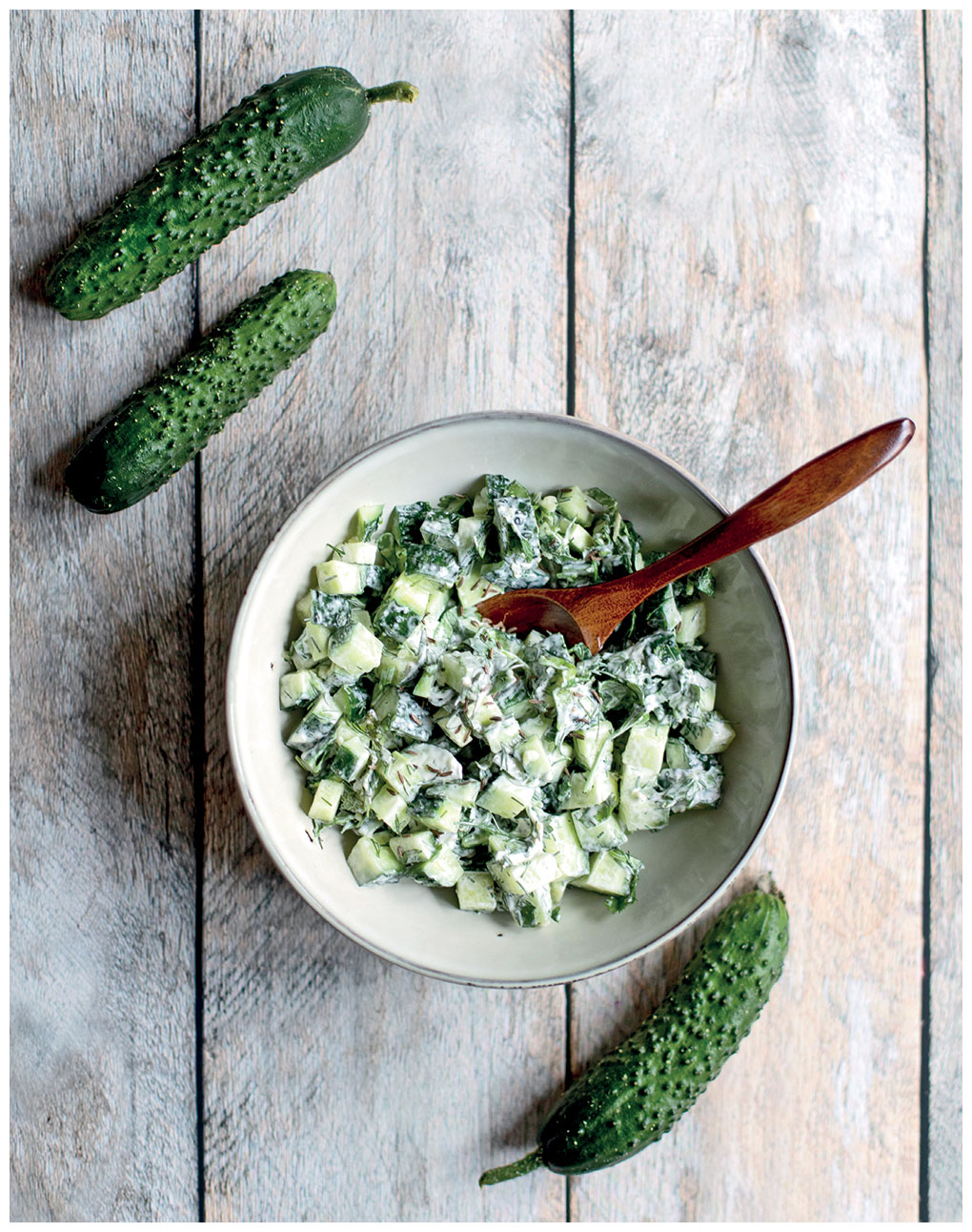 1. Огурчики режем небольшими кубиками вместе с кожурой, чеснок мелко нарезаем или пропускаем через пресс.