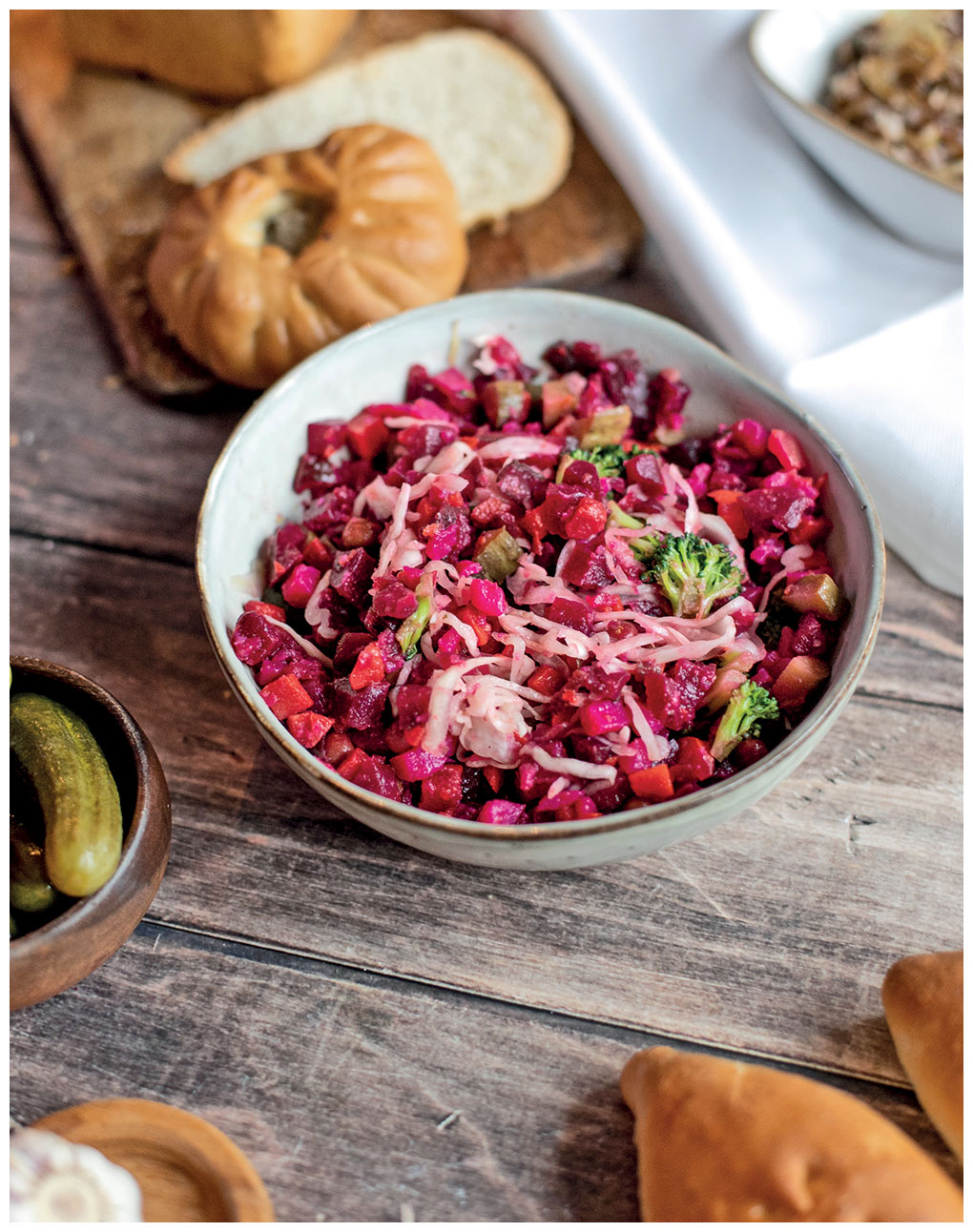 Салаты не типичны для русской кухни, самые известные, винегрет и оливье, имеют французские корни и появились лишь в XIX веке. Расцвет салатов пришелся на советские годы, их появилось так много, что некоторые стали гастрономическими визитными карточками различных городов и получили их названия.