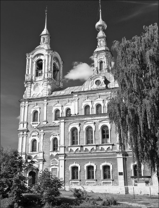 Две церкви стоят рядышком, Спасо-Преображенский храм был построен в конце XVIII века на месте одноименной белокаменной церкви 1164 года, соседняя одноэтажная Никольская церковь построена в 1670-х годах с великолепным декором – лепниной под крышей и вокруг окна.