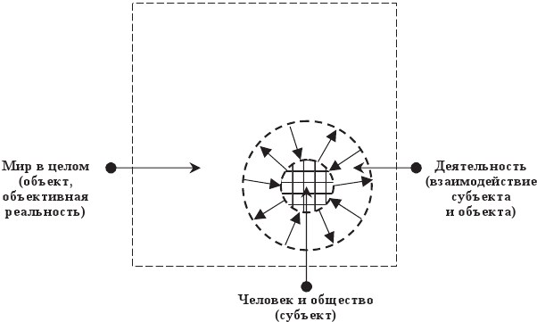 Итак, содержание философии составляют наиболее общие представления о мире в целом, его категориальной структуре, о человеке и обществе, в котором он живет, о способах деятельности или освоения человеком мира. Графически предмет философии выглядит так: