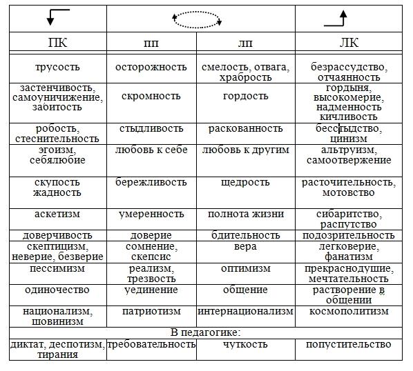См. на следующей странице таблицу, поясняющую схему взаимоотношения золотой середины, противоположностей и крайностей: