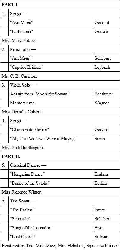 The concert was now over, and the audience indicated by the volume of applause that rang out that it was a great success. Everyone had done just what they thought was their very best, and many had received beautiful flowers. It wasn’t long before they were all home.