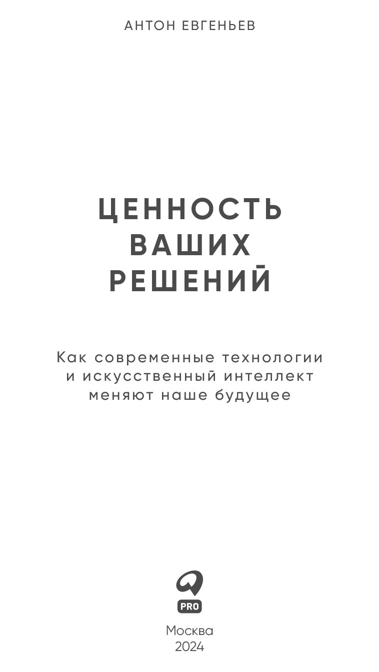 Название книги «Ценность ваших решений» в трех словах описывает важность решений, принимаемых нами сегодня. Мы живем в эпоху невероятных научных достижений, рождения новых индустрий, стремления к инновациям, необходимости постоянного обогащения себя новыми знаниями и навыками, поскольку мир вокруг нас меняется с беспрецедентной скоростью. Все это требует принятия быстрых и выверенных решений в работе, где нас уже окружают многочисленные помощники, способные сформировать необходимую для этого информацию, а в некоторых случаях и принять эти решения на основе искусственного интеллекта, который становится все привычнее. Это актуально не только в операционной деятельности, но и при принятии решений о направлениях развития бизнеса и инвестирования. Нам приходится делать это и в жизни, где необходимо понять устремления родных и близких, спланировать вместе с ними важнейшие вещи, как то: в каком направлении обучать детей, кем мы хотим их видеть, когда они вырастут, чему обучаться, чтобы иметь востребованную и интересную профессию, какое будущее мы для себя видим, готовы ли мы принимать изменяющийся, все более технологичный мир, открыты ли мы к новым знаниям.