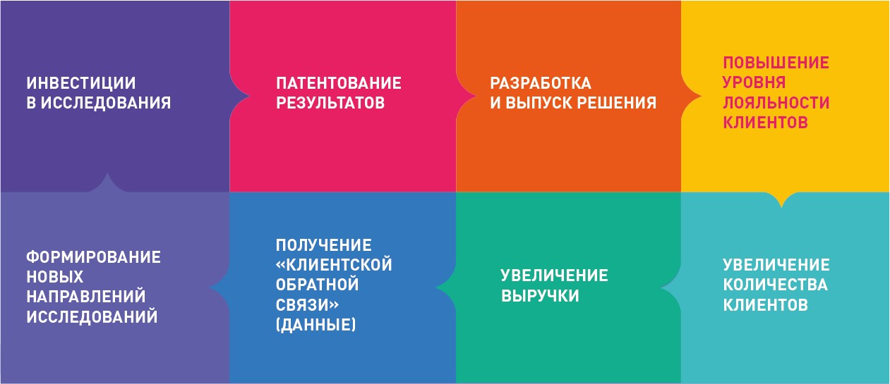 Для достижения лидерства в своей индустрии компании вынуждены быть инновационными, то есть не только инвестировать в повышение эффективности производства и взаимоотношения с клиентами, но и проводить научные исследования, делать свои решения технологичнее, внедряя самые современные инновации, обогащать их новыми сервисами и свойствами… Все это требует от лидеров рынка и их конкурентов проведения политики новых научно-технических открытий, защиты интеллектуальной собственности, формируя тем самым круговорот инновационной деятельности (рис. 1).