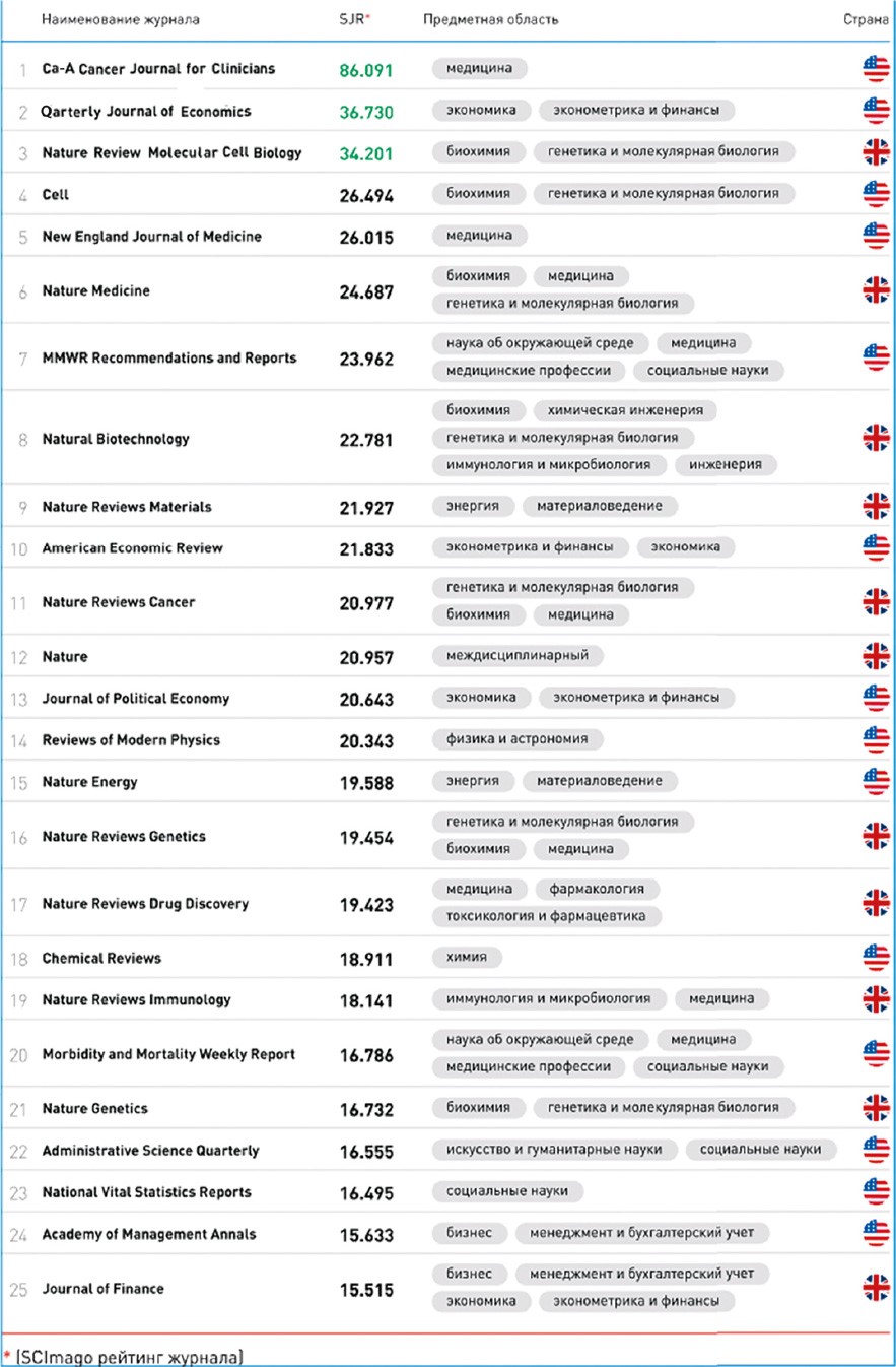 Логично, что одним из косвенных показателей науки как индустрии можно считать отношение к научному миру в обществе, измеряемое огромным количеством метрик, в частности популярностью, международным авторитетом и престижем научных изданий. Познакомим читателя с рейтингом самых престижных научных журналов мира, сформированным на показателях средневзвешенного количества цитирований публикаций в указанных журналах за три предыдущих года. Рейтинг составлен международной рейтинговой организацией Scimago Journal & Country Rank на основе данных Scopus по состоянию на апрель 2023 г., включающих 27 955 изданий (табл. 1).