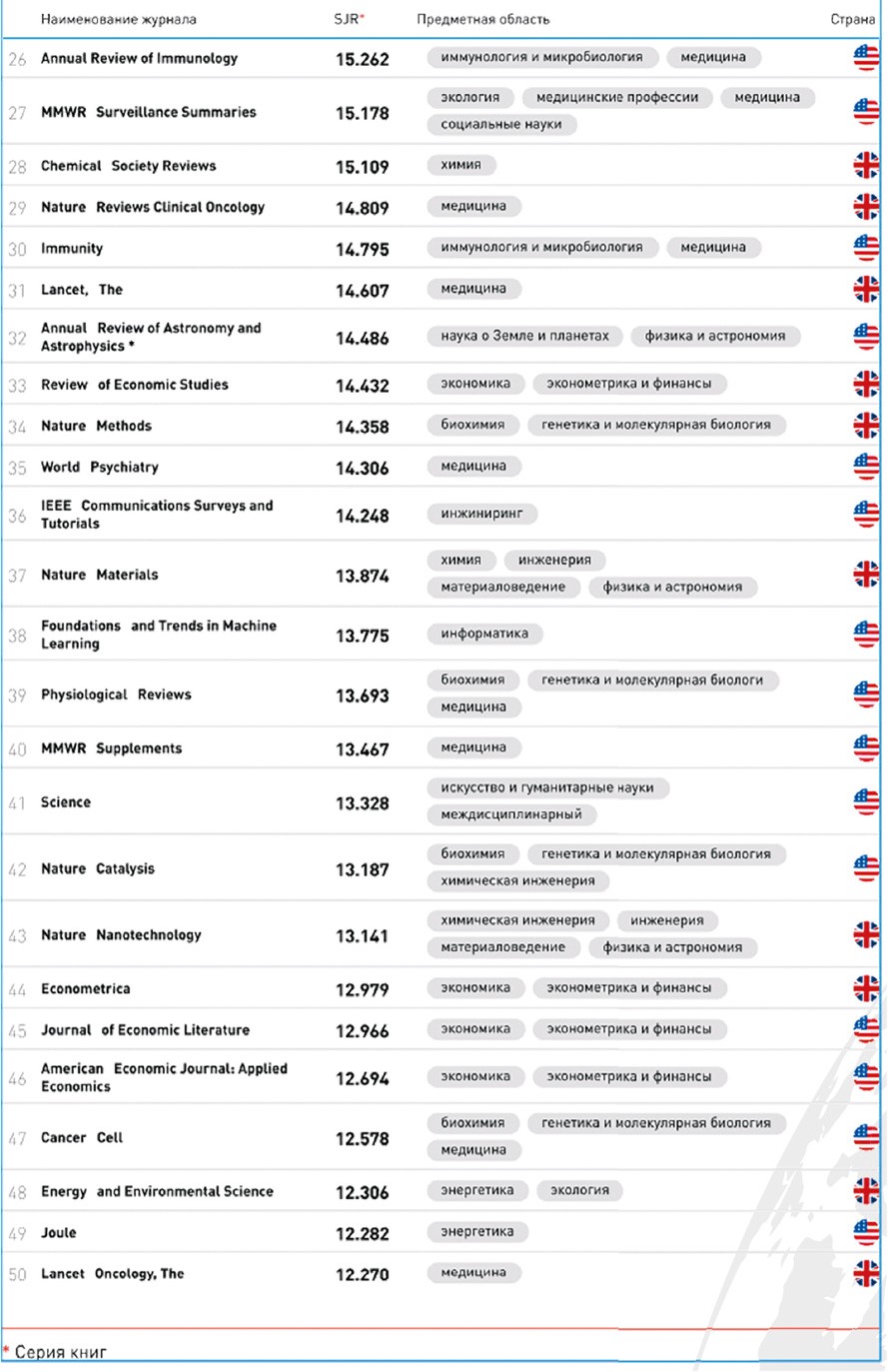Таблица 1. Рейтинг 50 самых престижных научных журналов мира[51]