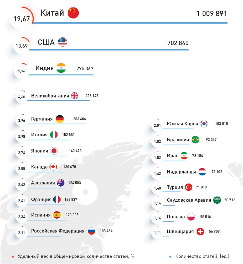 Одним из важнейших показателей, по которым оценивают состояние науки в той или иной стране, является количество статей в научных изданиях (в том числе указанных выше), индексируемых в Scopus. Далее приведем информацию о числе публикаций с разбиением по странам, к которым принадлежат авторы этих статей, по состоянию на апрель 2023 г. (рис. 2).