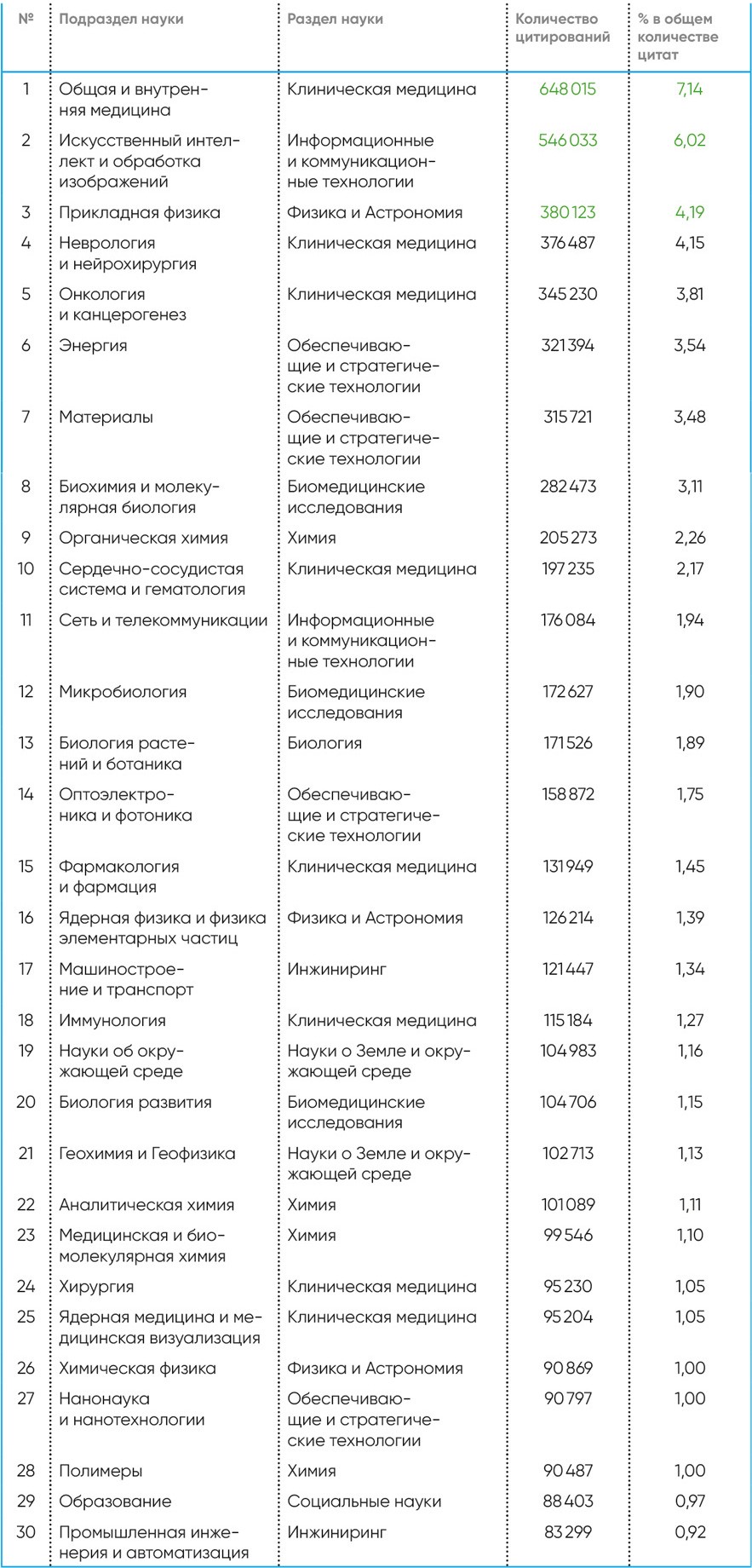 Помимо количества научных статей, еще одним важнейшим индикатором состояния науки и ее инновационного потенциала является их качество, определяемое количеством цитирований этих публикаций в научных изданиях, индексируемых в Scopus, поскольку демонстрирует актуальность и востребованность этих публикаций в новых исследованиях. С учетом того, что за последние несколько лет показатель цитирований достиг 9 071 122 публикаций, можно считать его достаточно объективным. Из довольно поверхностного изучения этой информации можно сделать интересные выводы относительно основных векторов развития глобальной научной мысли. Прежде всего, не перегружая читателя деталями, представим наиболее популярные направления научных исследований на основе общего количества цитирований по состоянию на 1 сентября 2022 г.[54] (табл. 2).