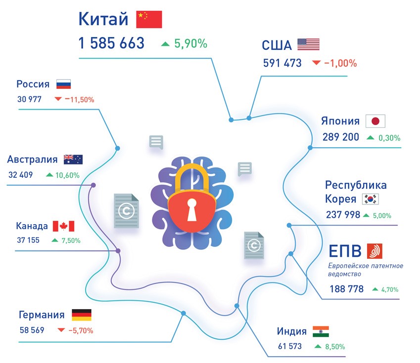 В 2021 г. в мире было зарегистрировано 16,5 млн действующих патентов (рост 4,2 %), из которых на Китай приходится 3,6 млн, на долю США – 3,3 млн, Японии – 2 млн. Также в мире насчитывалось 73,7 млн действующих регистраций товарных знаков (рост 14,3 % по отношению к показателю 2020 г.), самое большое количество из которых приходится на Китай – 37,2 млн, США – 2,8 млн, Индию – 2,6 млн.
