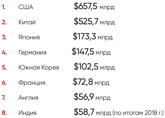 Мировые расходы на НИОКР с 2000 г. выросли в 3 раза: с $726 млрд в 2000 г. до примерно $2,4 трлн в 2019 г. Лидерство по объемам инвестиций в научные исследования принадлежит Соединенным Штатам, занимающим долю в размере около 27 % всех глобальных инвестиций в исследования и разработки. Сопоставимый объем инвестиций в науку направляет Китай – около 22 % всех мировых расходов на НИОКР. В абсолютных цифрах страны-лидеры в 2019 г. по бюджетным ассигнованиям в R&D расположены в следующем порядке: