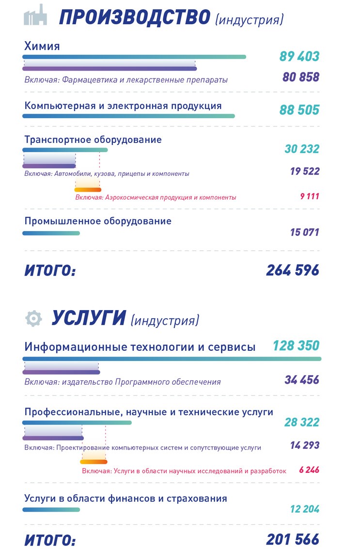 Довольно интересно, что американские компании, которые проводили или финансировали НИОКР, сообщили о чистых продажах на внутреннем рынке в размере $11 трлн в 2020 г. При этом для всех отраслей интенсивность НИОКР составила 4,8 %: для производства – 5,4 %; а для непроизводственной сферы – 4,1 %. Производственными отраслями с высоким уровнем интенсивности исследований и разработок в 2020 г. были фармацевтические препараты и лекарства (код 3254 по классификации NAICS) – 16,6 %, компьютерные и электронные продукты (NAICS 334) – 13,1 % и аэрокосмические продукты и запчасти (NAICS 3364) – 8,5 %. Среди непроизводственных отраслей наиболее высокий уровень интенсивности исследований и разработок демонстрировался в сфере услуг по научным исследованиям и разработкам (NAICS 5417) – 36,4 %, производства программного обеспечения (NAICS 5112) – 13,9 % и услуг по проектированию компьютерных систем (NAICS 5415) – 10,7 %.