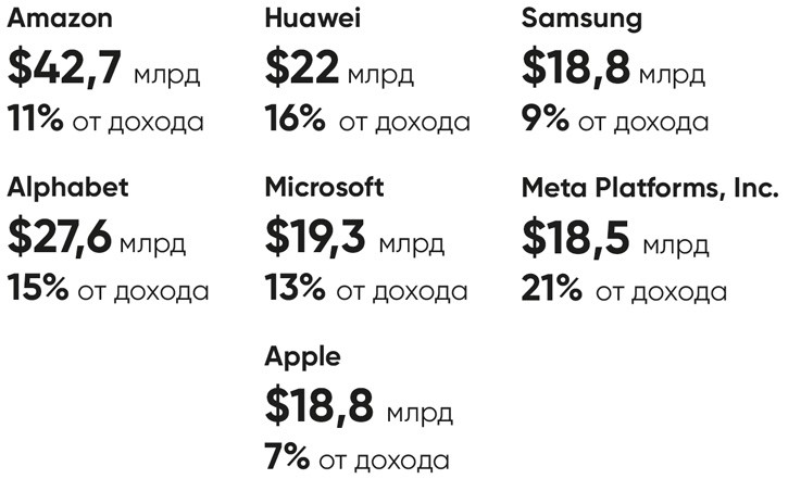 Неудивительно, что компании, обладающие крупнейшими бюджетами на исследования и разработки, являются технологическими гигантами и по совместительству крупнейшими компаниями мира (рис. 5). Согласно данным, собранным Nasdaq.com, первое место в мире по расходам в НИОКР занимает Amazon. Ее инвестиции в исследования и разработки в 2020 г. составили $42,7 млрд, или около 11 % ее доходов. На втором месте разместилась компания Alphabet, которая инвестировала в R&D $27,6 млрд, что составляет 15 % ее совокупного дохода. Третью строчку занимает китайская компания Huawei, которая потратила на инновации $22 млрд, что соответствует 16 % ее дохода. Компания Meta Platforms, Inc.[65] (ранее Facebook), занимающая 7-е место в рейтинге крупнейших инвесторов в исследования и разработки, является крупнейшим инвестором в R&D по отношению к собственному доходу, ее затраты составляют 21 %, или $18,5 млрд. Помимо приведенных ниже компаний, в рейтинг крупнейших инвесторов в научные исследования входят такие компании, как Volkswagen, Intel, Roche и Johnson&Johnson, представляющие также автомобильную и фармацевтическую индустрии[66].