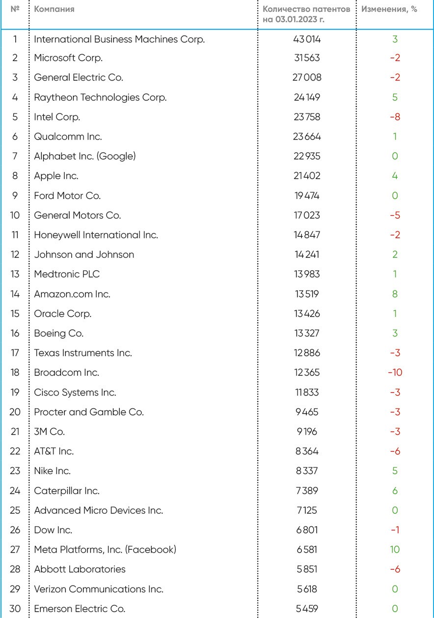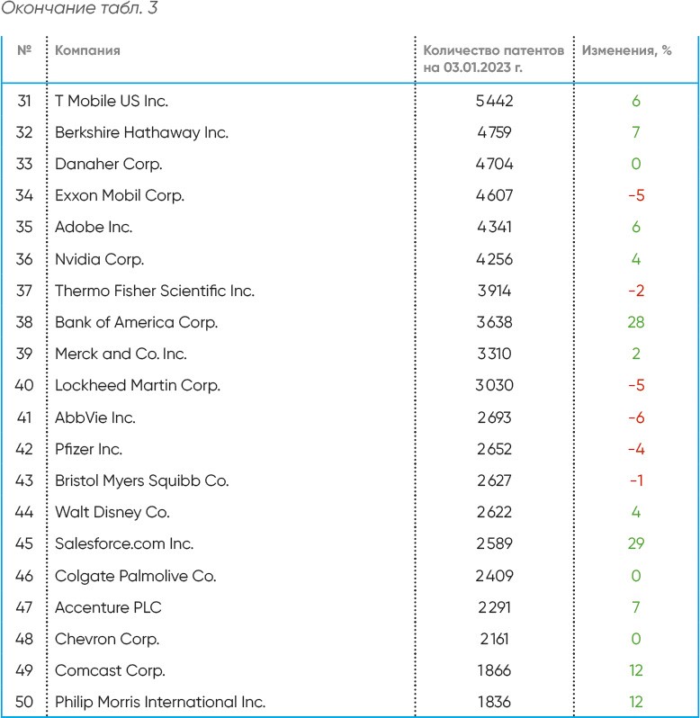 Таблица 3. Крупнейшие компании мира S&P50 по количеству патентов – 2022 г. (по состоянию на 3 января 2023 г.)[68], [69]