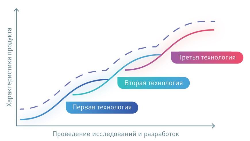 В данном случае развитие современной науки можно спрогнозировать до определенного горизонта, поскольку, накапливая данные, научные открытия, совершенствуя методы исследований, оптимизируя технологические решения в повседневной жизни и совершая на основе этой обратной связи открытия, мы совершенно очевидно обречены на научно-технический прогресс. Но время от времени человечество совершает научно-технологический прорыв принципиально иного масштаба. Последствия таких прорывов производят революцию в десятках отраслей, что ведет к кардинальным изменениям в экономике, научных исследованиях и даже структуре общества. Именно такие технологии экономисты называют технологиями широкого применения (ТШП). В своей книге «Вторая эра машин» профессор MIT (Массачусетский технологический институт) Эрик Бринолфссон и Эндрю Макафи описали ТШП как технологии, которые «достаточно значительны для того, чтобы ускорить нормальный темп экономического прогресса»[74]. Одним из ярких подтверждений этому являются информационные технологии, где изменения значений цены, производительности и емкости (на единицу времени, цены или другого параметра) практически точно следуют экспоненциальному закону и даже обгоняют некоторые научные концепции, на которых они основаны (такие как закон Мура). Но когда одна парадигма выходит из общего потока (например, когда в 1950-е гг. инженеры оказались неспособны дальше уменьшать размер и стоимость радиоламп), возникает такая исследовательская активность, которая рождает новую парадигму, и начинается новая S-образная кривая прогресса (рис. 7).