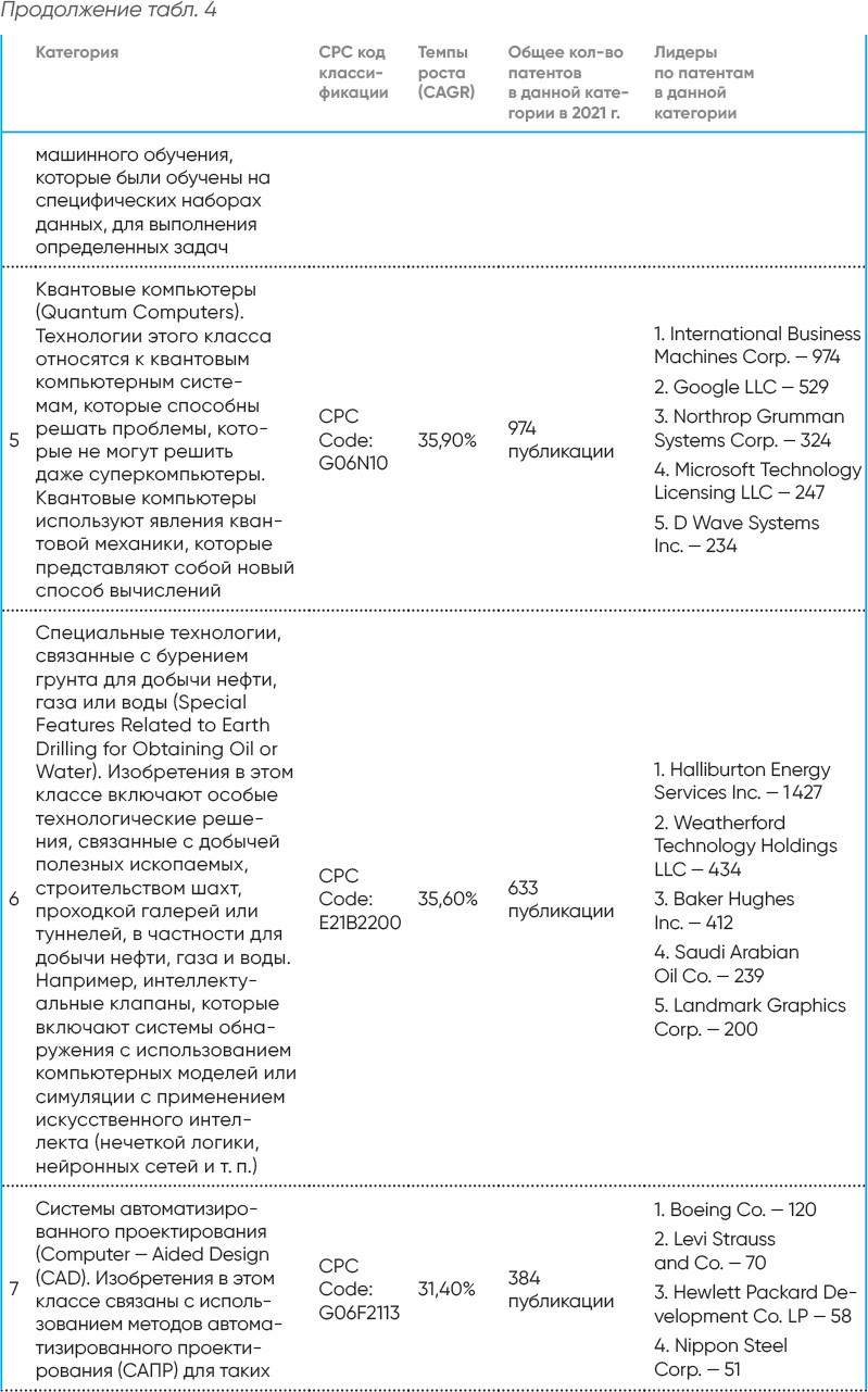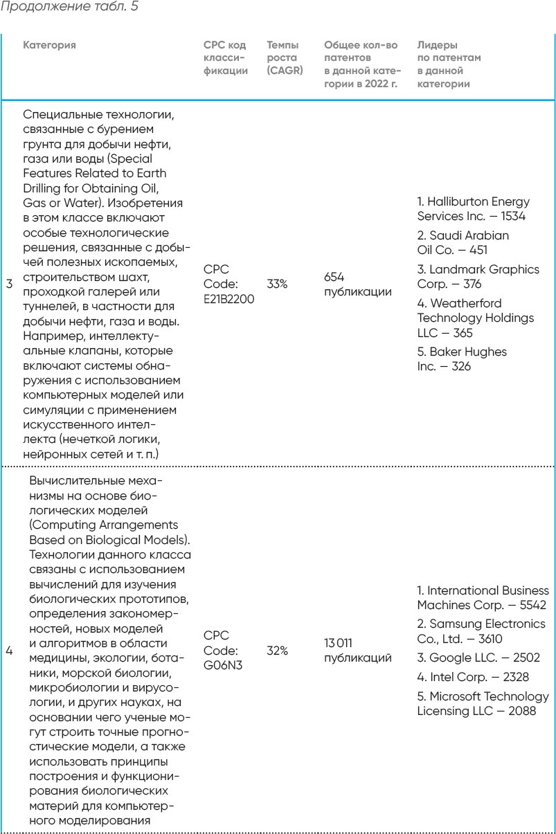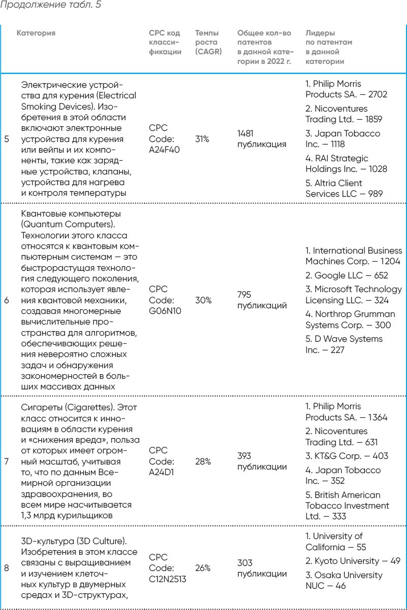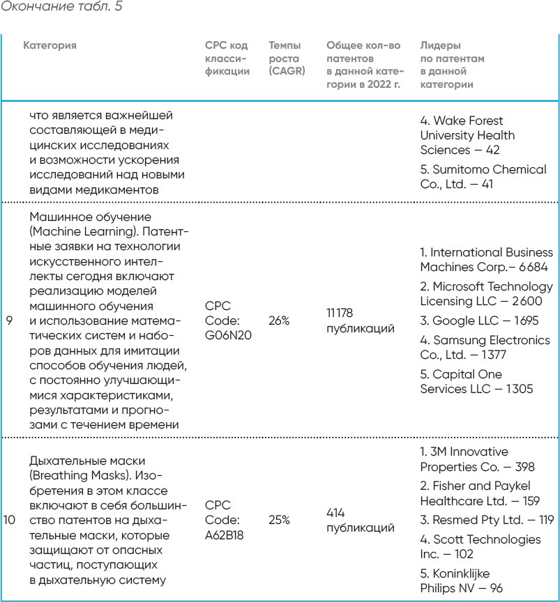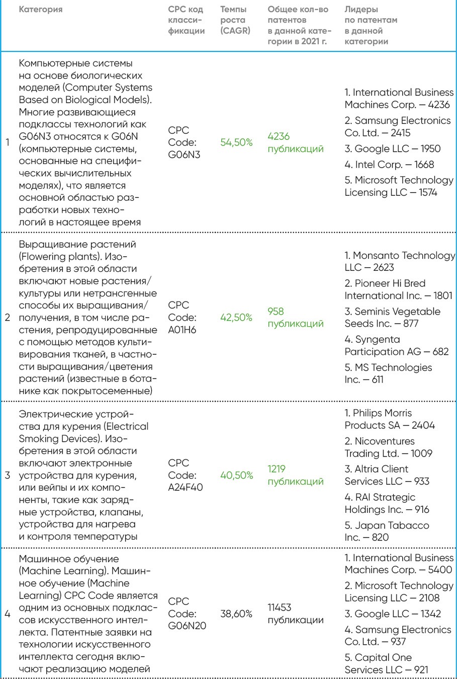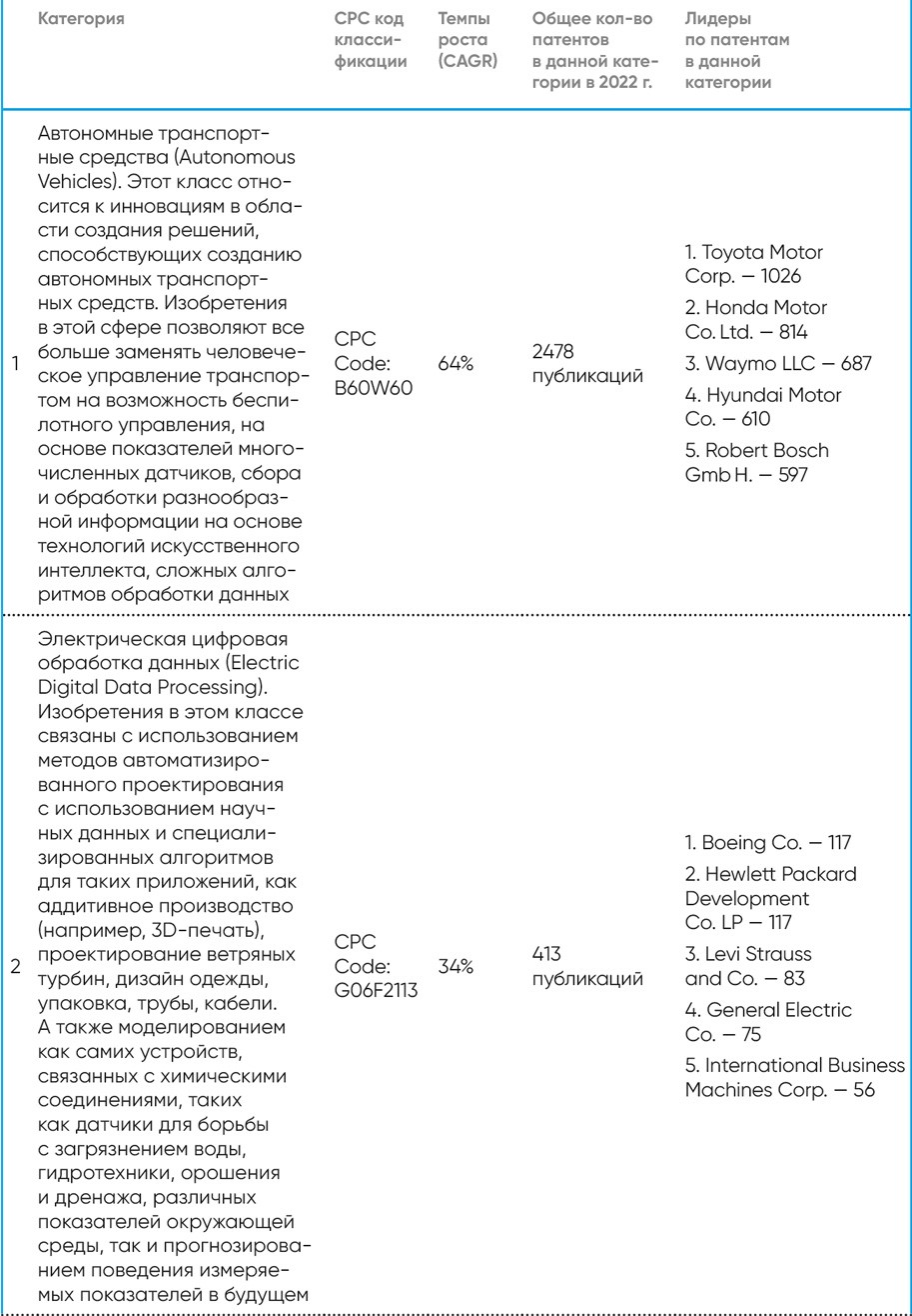 Отчет дает представление о самых быстрорастущих патентных классификациях и компаниях, инвестирующих в эти области. Патентные публикации сгруппированы по кодам CPC (Cooperative Patent Classification–совместной патентной классификации), из которых были выбраны самые крупные из всех 3376 категорий на основе показателя CAGR (Compound Annual Growth Rate)–совокупного среднегодового темпа роста за последний пятилетний период (2017–2021 и 2018–2022 гг.). В качестве первоисточника используются данные USPTO (United States Patent And Trade Office)–Федерального агентства по патентам и регистрации товарных знаков США[83].
