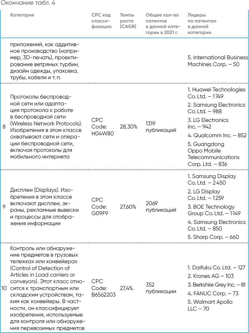 Анализ IFI Claims Patent Services и составленный на его основе «Рейтинг 10 самых быстрорастущих технологий на патенты, оформленные в США»[81], [82] – один из наиболее эффективных инструментов, позволяющих определить технологические направления развития крупнейших корпораций мира, погрузиться в изучение самых перспективных трендов и понять, кто и как планирует на них зарабатывать на самом конкурентном технологическом рынке мира, на котором разворачивается борьба за глобальное лидерство в сфере высоких технологий. Для удобства читателя информация представлена в динамике изменений за 2022 г. и для наглядности приведены данные за 2021 г. (табл. 4, 5).
