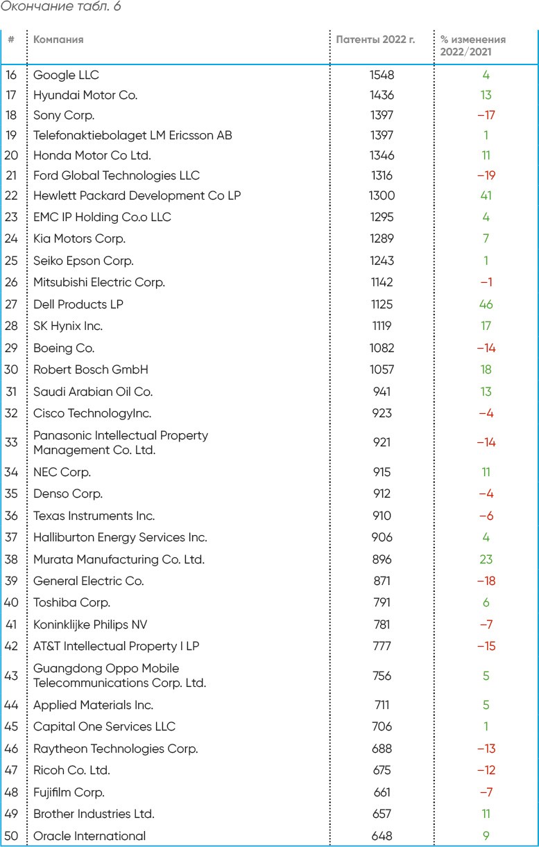 Итак, в таблице 6 представлен список 50 самых интеллектуально богатых компаний, составленный на основе количества патентных заявок по данным Федерального агентства по выдаче патентов США и регистрации товарных знаков компанией IFI Claims Patent Services[85].