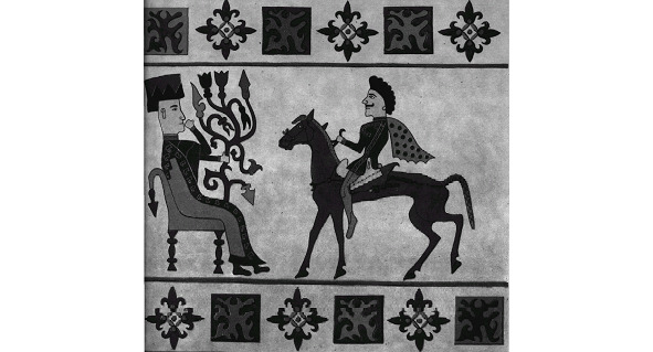 Фрагмент ковра из Пазырыкских курганов (Алтай). IV – III вв. до н. э. Войлок. (Реконструкция по сохранившимся в разных частях ковра повторениям этого сюжета. Бог – это жрец-колдун, который гипнотизирует всадника, возможно вождя или воина)