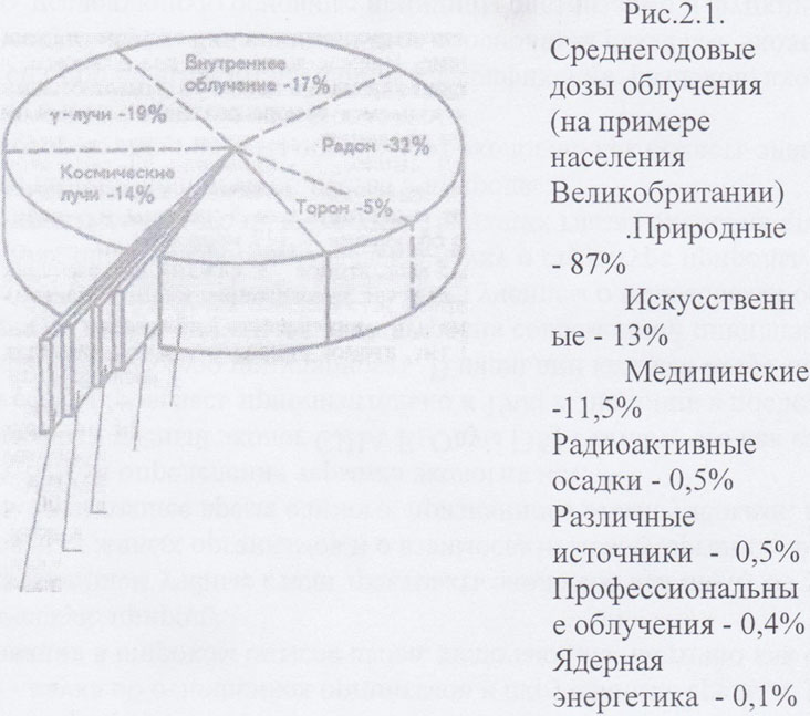 В среднегодовых дозах облучения при нормальных условиях доминируют природные источники (рис. 2.1). В реальной жизни отмечен широкий диапазон индивидуальной радиочувствительности (резистентности) людей при однозначном признании существования групп риска – детей и беременных женщин.