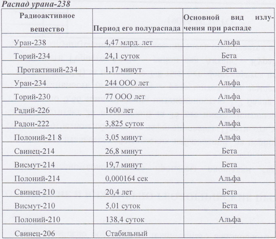 В табл.2.1 представлены радиоактивные вещества, образующиеся при распаде урана-238, период их полураспада и вид излучения, сопровождающий этот распад [51].