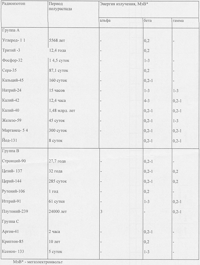 – группа А – элементы, составляющие основу живого вещества (приводятся их радиоизотопы);