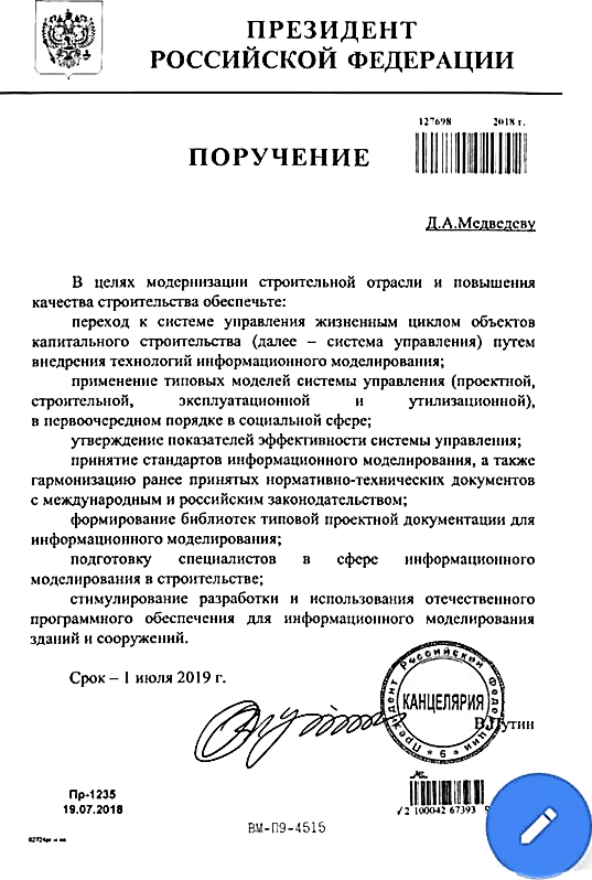 С поручения Президента России от 19.07.2018 № 1235 (рисунок 4), по сути, началось более-менее планомерное государственное внедрение информационного моделирования. Срок до 1 июля 2019 года, как мы уже сейчас понимаем, был не совсем реальным, но, с другой стороны, дай нам срок больше – и мы бы сейчас только начинали.