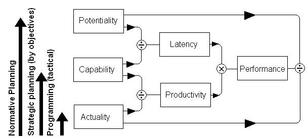 Состояние VSM характеризуется триадой показателей эффективности. Фактический показатель AIпредставляет собой то, „что нам удается получить в настоящее время при существующих ресурсах и существующих ограничениях”. Расчётный показатель CI: „Это то, что мы могли бы достигнуть (т.е теперь) при существующих ресурсах, при существующих ограничениях, если бы мы действительно принялись решать такую задачу”. Потенциальный показатель PI – „Это то, что нам удастся сделать, развивая наши ресурсы и снимая ограничения, действуя в пределах наших средств и возможностей”. Из определения следует, что расчётная производительность конкретной VSM определяется, как отношение фактического показателя AI к расчетному CI и является объектом управления подсистемы III. Под скрытой производительностью понимается отношение расчетного показателя CI к потенциальному PI, а текущей – отношение фактически достигнутого уровня AI к потенциальному PI или отношение скрытой и расчетной производительности414. Соотношения векторов эффективности представлены на схеме 10.