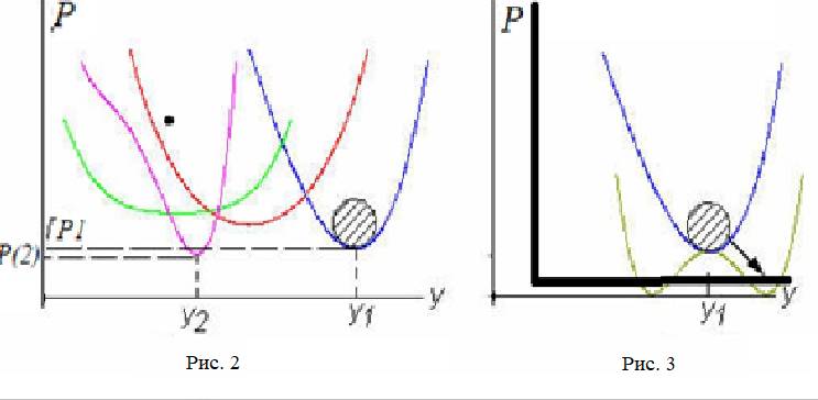В идеале математическая модель предполагает знание всех отображений функций f(х) и φ(х) α, β.…, Ω, позволяющих точно описать модель процесса, что на практике представляется бесперспективным424. Использование математического аппарата теории катастроф позволяет упростить модель, используя минимум информации о функциях f(х) и φ(х). Учитывая, что система работает устойчиво при условии Р ≥ Х, её можно представить на рис. 2, где условно отмечены область положения системы (условно заштрихована) и четыре траектории функции полезности425, т.е. зависимости дохода Р от размера y. Каждая из них отличается набором управляющих параметров α, β.…, Ω. При их плавном изменении кривые полезности сдвигаются, меняя область значения функции. При этом устойчивость работы, определяемая её единственным экстремумом, сохраняется, если находится в докритичной области катастрофы.