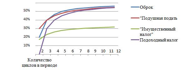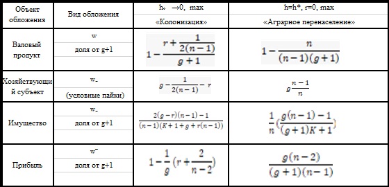 Следует также отметить, что подушное обложение и имущественный налог мотивируют ЕО в случае избытка запасов, поскольку не освобождают их от налогообложения даже в нулевой цикл. Наиболее показателен последний столбец таблицы, который хорошо соотносится с нормами налогообложения стран Восточной Азии, имевшими аграрное перенаселение. Даже в случае каждого второго неурожайного года у них при тройном удельном доходе ЕО () изымалась половина доходов, оставляя их на гране выживания. Такая ситуация возникает только при очень высокой аграрной плотностью населения, труд которого чрезвычайено дешёв.