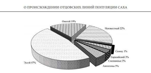 Расширенный анализ ДНК(РГА) якутов594 в сравнении с другими тюркскими народами выявил одну особенность якутского генофонда: предельно низкий уровень разнообразия отцовских линий595 и достаточно высокий уровень для материнских. Следуя генетическим реконструкциям, историю отдельных якутских родов можно восстановить, анализируя их отцовские и материнские линии. В результате выясняется, что начальная популяция саха была малочисленной и характеризовалась доминированием мужчин одного рода. Чисто теоретически, прародителем всего народа мог быть один пассионарий, занимавший доминирующее положение в социальной структуре и сформировавший единственную для данного этноса родоначальника. Этот факт отразился в эпосе и фольклоре саха596.