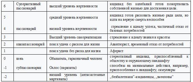 По достижении определённого рубежа этния начинает свою экспансию, синхронизируя (поглощая или подчиняя) соседей. Любопытно, что, оказавшись в чуждой для неё среде, её представители легко могут менять свой генетический код: расу, разрез глаз, цвет кожи, сохранив при этом свои культурные отличия. Помимо пассионариев любой этнос содержит индивидов ещё двух подклассов. Обыватели или „гармоничные люди” находятся в равновесии с окружающей их средой, т.е. их поведение синхронизировано с системой. В конфуцианском толковании – это „вэнь”598 – люди, чьи нравственные обязанности, поскольку они материализуются в ритуале, становятся делом воспитания, образования, культуры. Третью категорию индивидов составляют субпассионарии – индивиды, склонные к паразитизму, и/или „асоциальные” личности с ущербными, порочными и/или преступными наклонностями. К ним относятся симулякры, „змееловы” и другие балластные элементы системы. Мерой пассионарности этноса является удельный вес пассионариев в социуме. Методология этногенеза выделяет шесть уровней пассионарности и два субпассионарности. Все они отображёны в таблице IV.