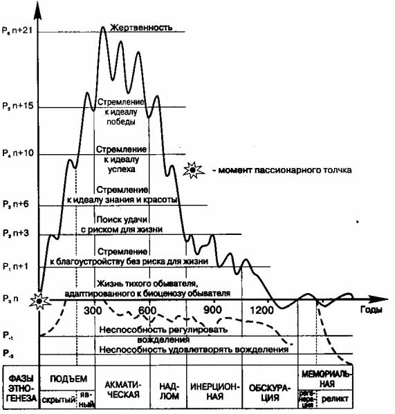 На диаграме 2 отражены основные этапы этногенеза, в представлении Л.Н. Гумилёва. Построение динамики этноса, отображённой на ней, строилось на трёх критериях600: