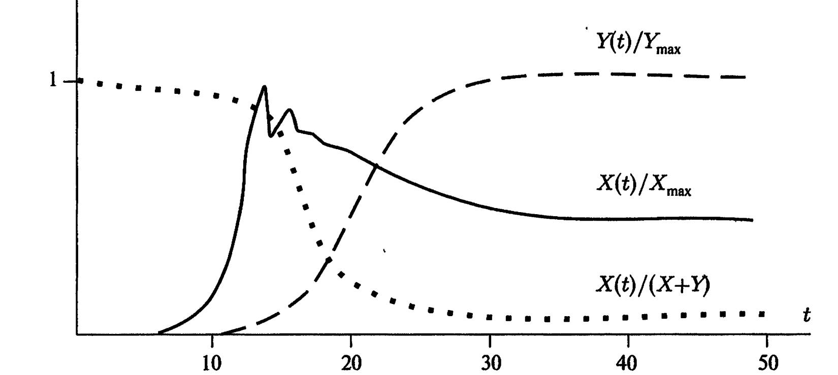 Обозначения: X(t)/ – количество пассионариев, Y(t)/ – численность непассионариев, X(t)/(X+Y) – относительная численность пассионариев в этносе
