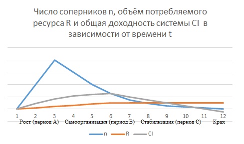 В период В соперничество постепенно упорядочивается за счёт исключения „неудачливых” соперников, стратегии, издержки и эффективность которых не соответствуют условиям локального равновесия732. При этом вследствие случайного стечения обстоятельств могут выбыть из соперничества субъекты с ИИМ, обеспечивающим наивысший институциональный престиж и наиболее низкие издержки. В этногенезе этому периоду соответствуют акматическая фаза, в конце которой заканчивается экстенсивное расширение этносоциальной системы. На этом этапе начинаются конкуренция за ресурс и, как её следствие, накопление энтропии. Благодаря эффективному использованию ресурса на короткий срок создаётся ощущение всеобщего процветания и неограниченных возможностей.