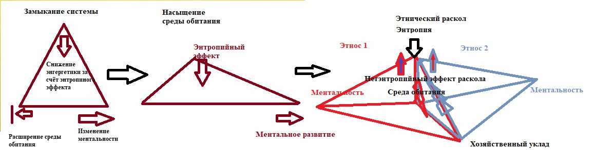 Снижение энергетики этносоциальной системы при фиксированном хозяйственном укладе приводит к тому, что управляющая подсистема, стремясь сохранить площадь институциональной матрицы начинает раздвигать границы системы,” раздвигая” границы системы в направлении среды обитания и ментальности. В тот момент, когда выполняется уравнение , устойчивость системы становится равной 0, вследствие чего она сходит с траектории. Поскольку предел значения определяется ограничением (6*), энтропийный эффект сказывается на изменении ментальности этноса, связанную со снижением пассионарности этноса. Механизм этнического надлома иллюстрирует схема 16.