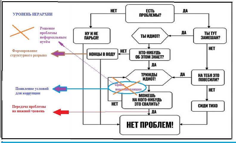 Продвигаясь по иерархической лестнице вверх, отобранный кандидат будет придерживаться тех же принципов формирования своей команды, что и его предшественники. Такая практика способствует перманентному количественному росту иерархических структур, осуществляющих прямое управление. Построенное по принципу отрицательной обратной связи, оно не в состоянии улавливать изменения ни внешней среды, ни самой системы. Вследствие этого управление демонстрирует „велосипедный эффект”937 и не способно решать насущные проблемы и, тем более, реагировать на вызовы (Схема 17).