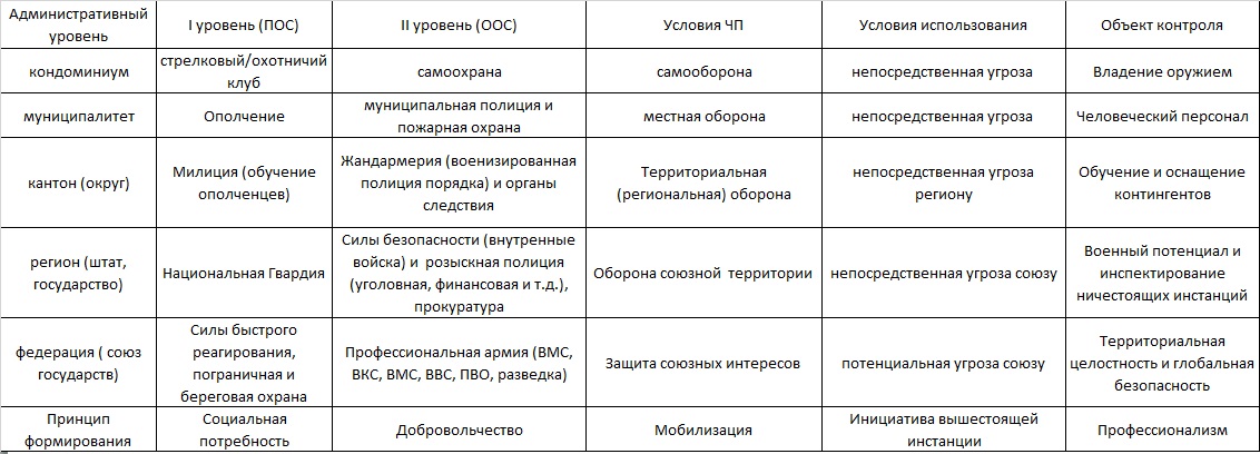 Такая система военной организации плохо совместима с профессиональными армиями современности. Необходимость существования их сохраняется, поскольку индивидуальное оружие помогает защититься от нападения преступников, но не от хорошо организованного, обученного и высокоотехнологического внешнего врага. Опыт многих стран, в которых сохранили действенные механизмы вооружения народа, по сравнению с периодом обеспечения правопорядка исключительно возможностями государственных структур, показывает значительное снижение уровня преступностиВ наиболее законченном виде эта концепция реализована в Швейцарской конфедерации. Конституция США также предусматривает индивидуальное вооружение граждан и формирование национальных гвардий отдельных штатов, сформированную из добровольцев. Сюда же, безусловно, относится Армия обороны Израиля, которая копировала скандинавские образцы начала ХХ века. Принцип распределения военных функций “вооружённого пацифизма” приведен в Таблице XIII.