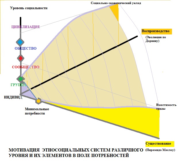 Оригинальная модель структуры потребностей на основе пирамиды Маслоу, предложенная С.А. Четвертаковым163, даёт возможность установить однозначное соответствие между мотивациями индивидов и императивами одного или нескольких объединений, членом которых он является. Следует отметить, что обе составляющих этой модели находятся в постоянном движении вследствие приобретения жизненного опыта и изменения уровня активности личности. По этой причине их совокупность целесообразно изучать в динамике.