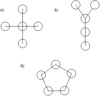 Схема 6. Информационными сети Ливитта: а) «штурвал» как аналог иерархии труда; б) форма «у» – компромиссная сеть; в) «колесо» – связь через соседей.