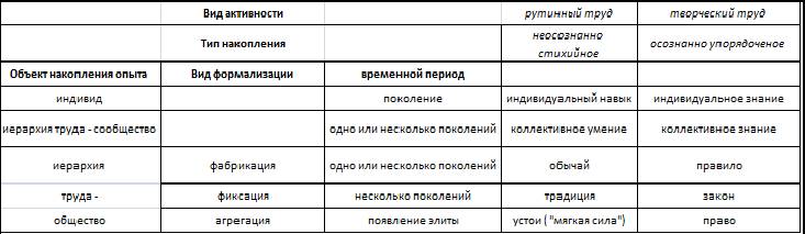 Сам процесс управления внутри иерархии труда представляет собой определённый набор управляющих воздействий или алгоритм, который определяется уровнем развития иерархии, её элементов и длительностью их формирования. В общем виде все механизмы управления активностью отдельных индивидов и их групп можно представить в виде Таблицы I, которая позволяет соотнести различные типы принципов и норм трудовой активности, выработанных на основе практического опыта и/или в процессе научного эксперимента. Как правило, в развитой иерархии труда они существуют и действуют одновременно. В большей части ситуациий они дополняют друг друга, но в некоторых вступают в противоречие.