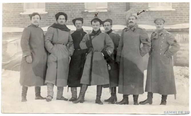 Войсковой старшина И.П. Красильников Есаул Калмыков(Х) и есаул Бочкарёв(стрелка), 1919 г.