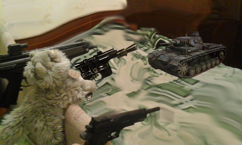 Пока мы все пребывали в, мягко говоря, шоке, Злючкин «Панцер» уже почти приблизился на расстояние, с которого можно было предполагать его прицельную атаку. Медлить было нельзя, а следовало что-то предпринять, иначе и боя-то не состоится: махина разнесёт всю тюрьму, даже не заставив нас вступить в бой. К счастью, Рекс напомнил мне про наличие в наших лапах козыря – бластеров.