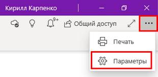 Параметры OneNote находятся справа в верхнем углу. Изображены в виде трёх горизонтальных точек.