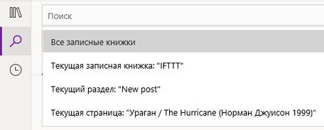 Можно гибко настраивать область поиска: все записные книжки, только текущая записная книжка, текущий раздел или текущая страница.