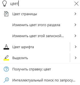На изображении выше по запросу «цвет» «Помощник» помимо поиска в интернете и получения справки предлагает выполнить любую команду на эту тему: изменить цвет страницы, раздела, записной книжки, шрифта и фона текста.