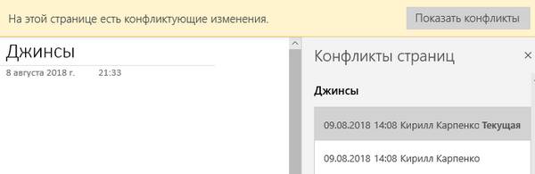 Выше мы рассмотрели ситуацию с перемещёнными разделами. В других случаях в результате ошибок синхронизации появляются конфликты внутри страниц. О конфликте нас информирует информационная панель над страницей.
