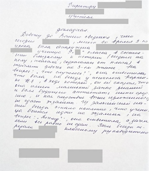 «Довожу до Вашего сведения, что сегодня 19 мая, мною во время 3-го урока была обнаружена Иванова Мария ученица 9 «И» класса в состоянии близкому к истерии (сидела на полу, плакала, содрогалась от плача) в туалете девочек на 3-м этаже. На вопрос: «что случилось?», она ответила, что была на беседе у психолога Карпенко К. Е., в ходе которой, он ей сказал, что она имеет маленький запас знаний и балл будущего аттестата ниже среднего, и как следствие выше изложенного, не сдаст экзамены. Из дальнейшей нашей беседы стало понятно, что ученица боится идти на экзамены. На вопрос: «Почему?», она ответила, а зачем если все равно не сдам. После беседы передала Машу классному руководителю.