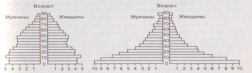 Рис. 1. Половозрастная пирамида. Половозрастные пирамиды стран первого и второго типов воспроизводства населения.
